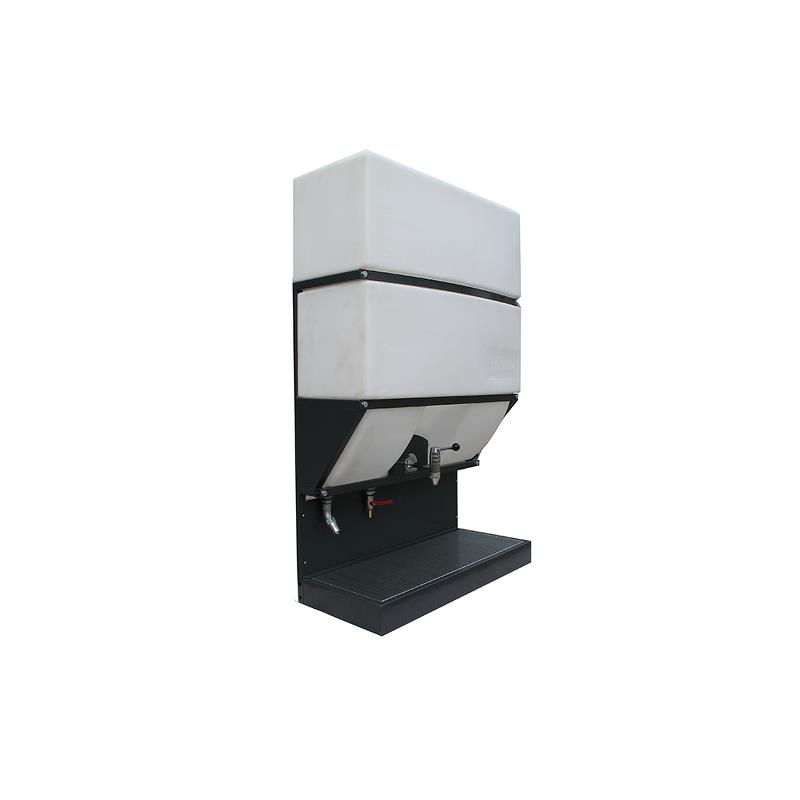Opslagunit voorzien van zelfsluitende RVS aftapkraan aan voorzijde van de tank. Vulmogelijkheid van onder af middels vloeistofkoppeling 1/2″. Aan de onderzijde van de tank is een drain aangebracht voor het aftappen van het restproduct. Tank is voorzien van gegalvaniseerde aansluitstukken en kogelkranen t.b.v. het vullen en aftappen.